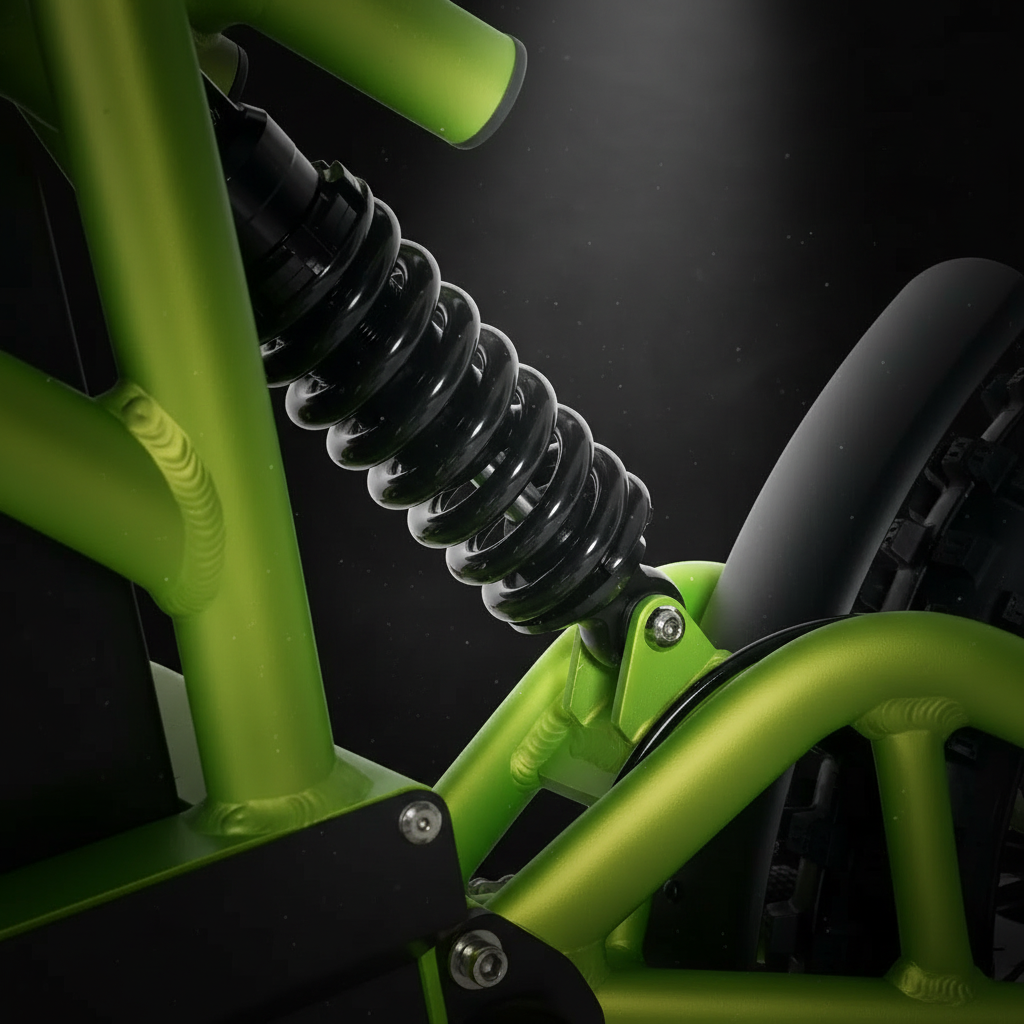 Absorb every impact—adjustable front damping and rear spring suspension keep you stable on rough trails and steep climbs.