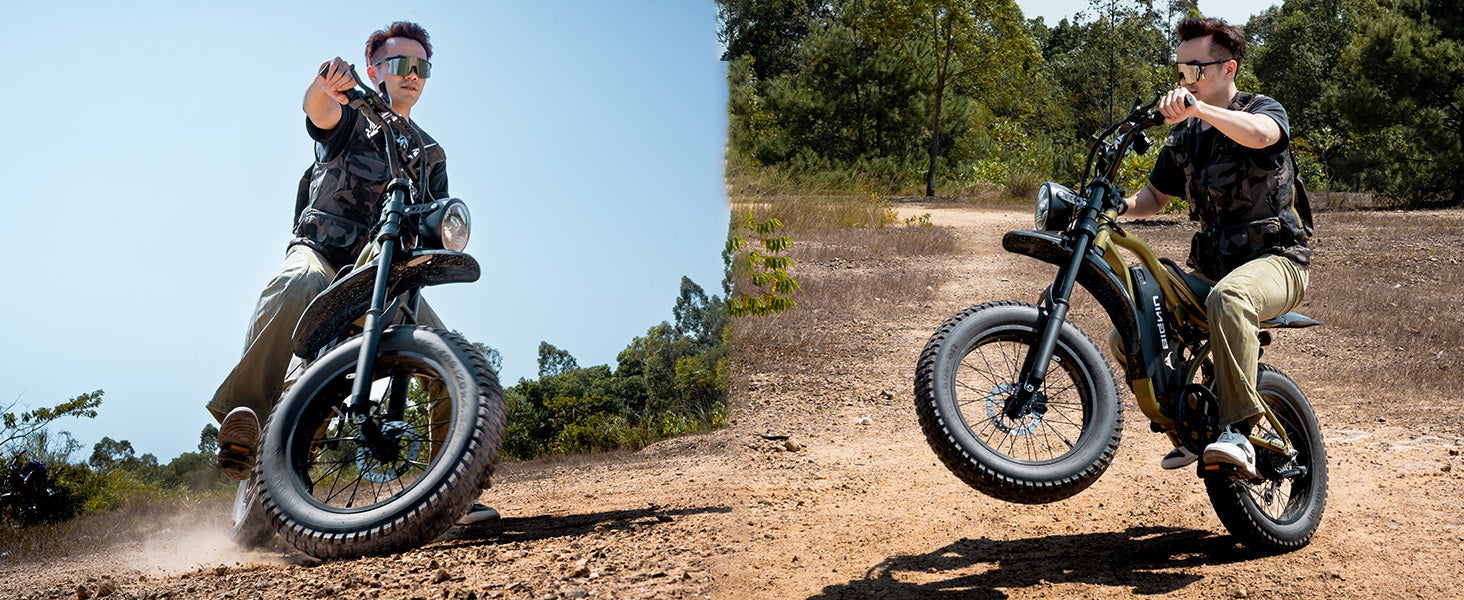 [ All-Terrain Riding ] With 20"x4.5" fat tires, you'll easily tackle mud, snow, and other challenging terrains. The uniquely designed front and rear fenders effectively shield against splashes of dirt and snow, ensuring a cleaner ride.