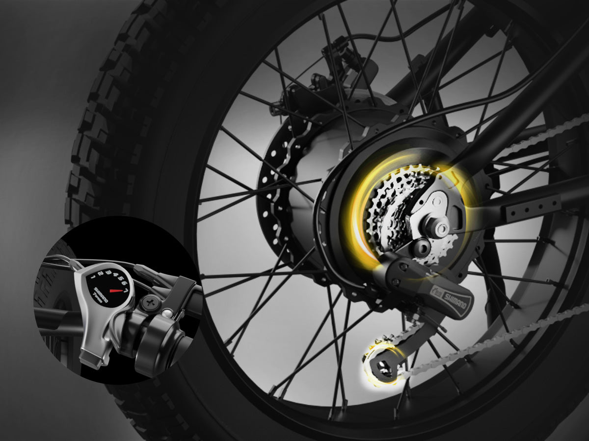 [ 3 Riding Modes & 7-Speed Gear ] The BG-S e-bike features pedal, pedal-assist, and pure electric modes for versatile riding. Seamlessly switch between full-electric cruising, assisted pedaling, or traditional cycling. The 7-speed gear system adapts smoothly to hills, flat roads, and varied terrains.