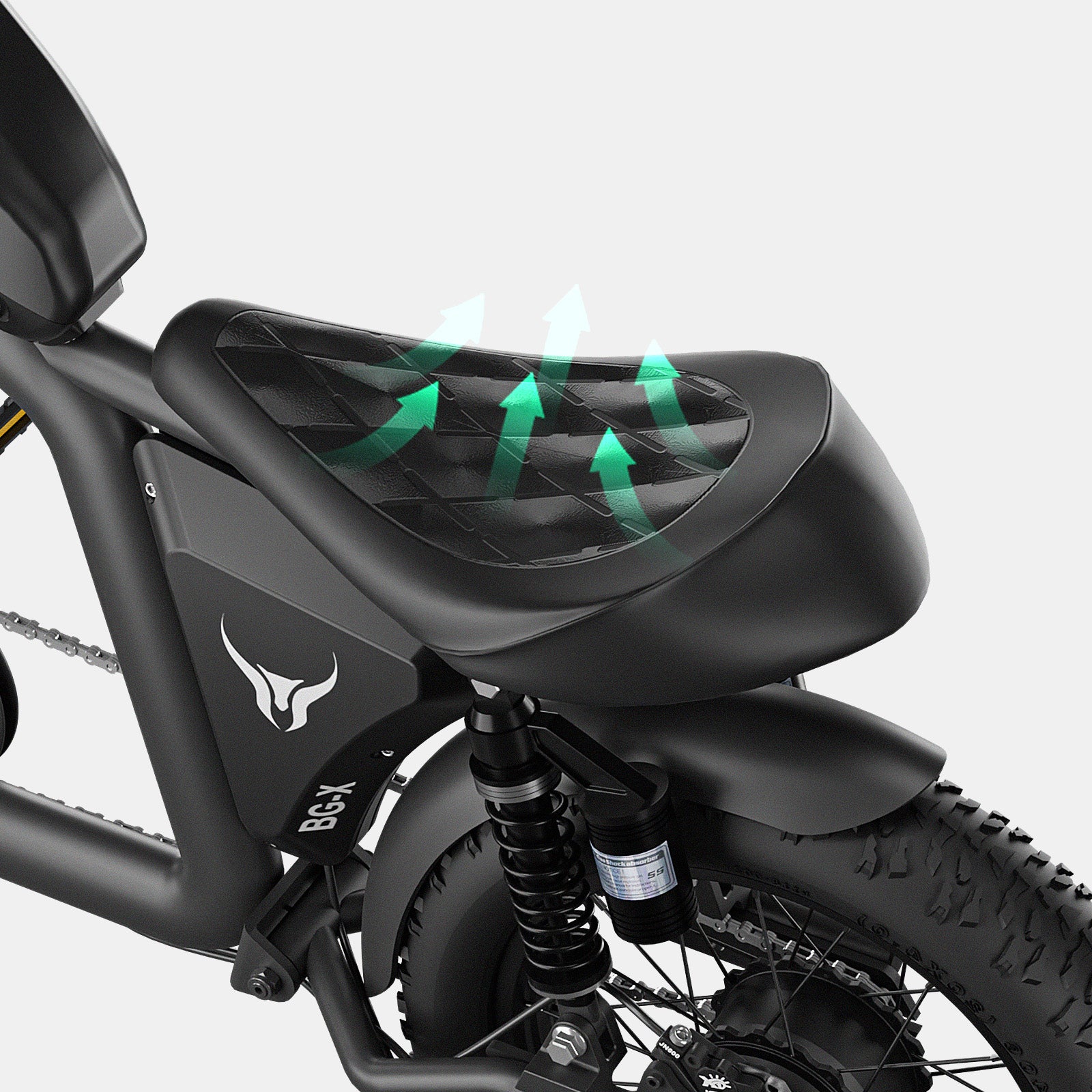 The BG-X PRO electric bike with a front inverted fork and a new rear dual suspension system, efficiently absorbing road bumps to deliver a smoother and more comfortable ride, effortlessly tackling all types of terrain!