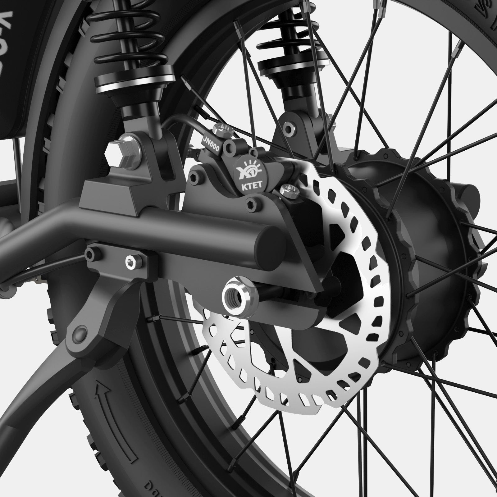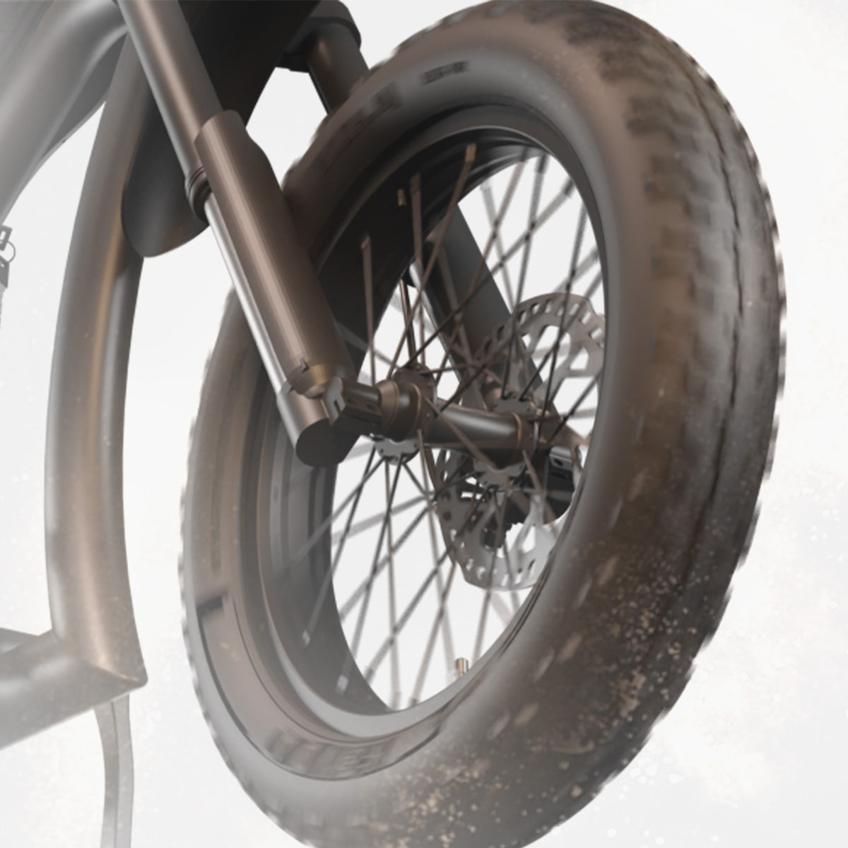 Motorcycle-style inverted front fork and adjustable rear shocks absorb bumps with ease, keeping your ride stable and comfortable on rough roads or trails.